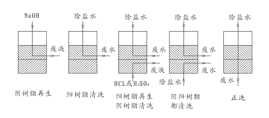不被水沖出為最佳控制流速,以陰陽(yáng)樹脂分層界限分明為反洗終點(diǎn)。反洗結(jié)束時(shí)應(yīng)緩慢關(guān)閉反洗閥,使